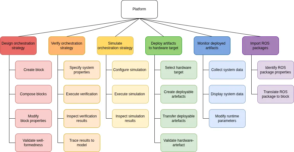 The functional decomposition breaks the platform down into its main responsibilities and logical subsystems. Rather than focusing on implementation details, it highlights which core functions the system must provide and how these functions relate to one another. This view is useful for reasoning about separation of concerns, maintainability, and the overall internal organisation of the platform.